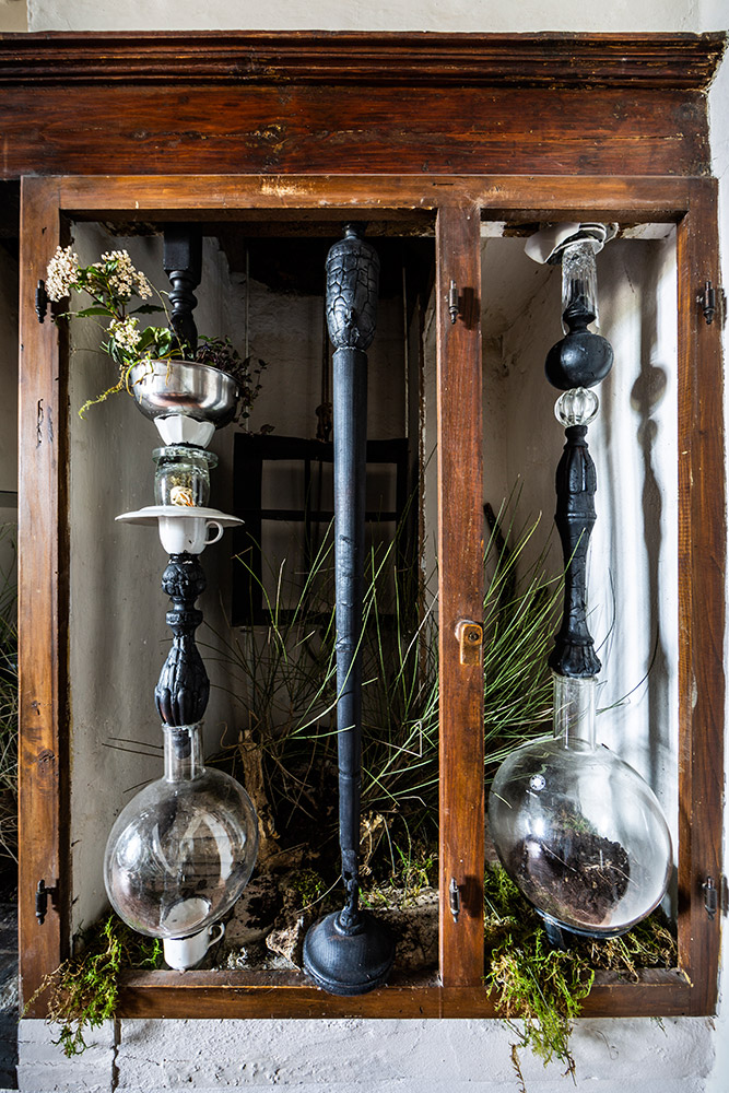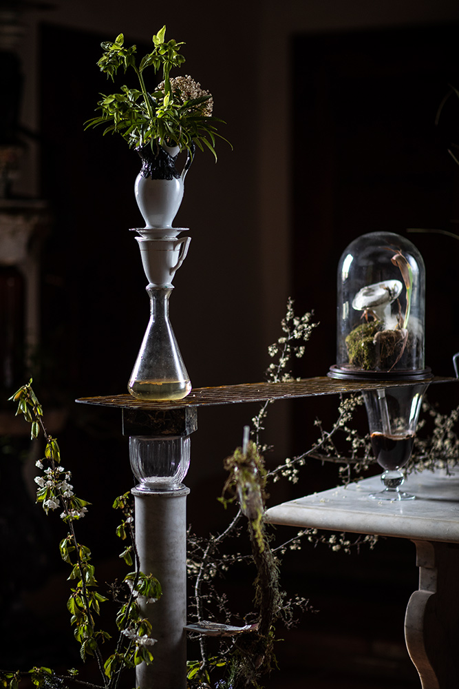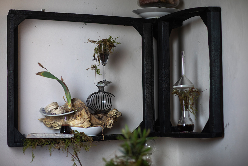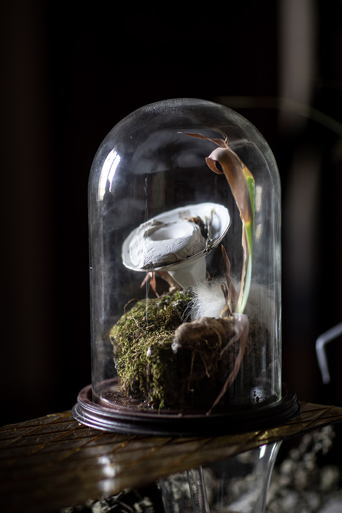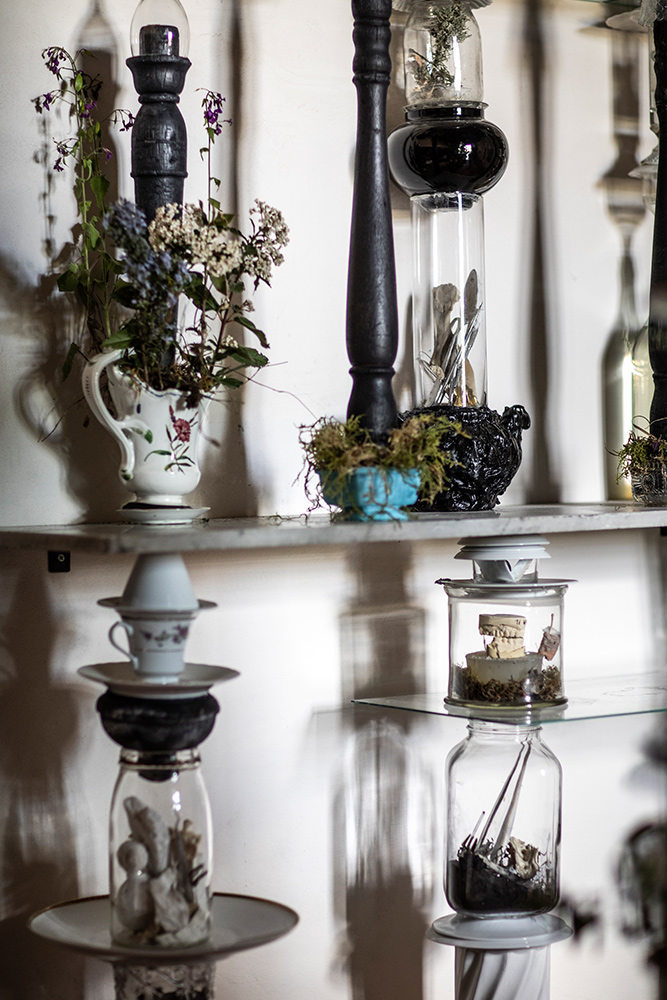 L’opera subisce una trasformazione materica continua, data dal cambiamento degli elementi organici di cui in parte è composta. Organico e inorganico si coniugano all’interno di contenitori della memoria attraverso i quali è possibile immergersi in un’ esperienza visiva e olfattiva.