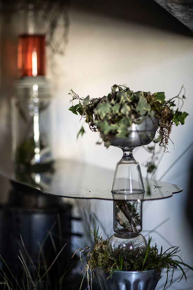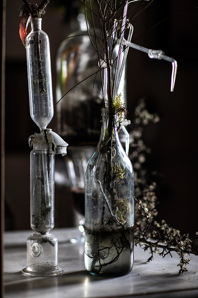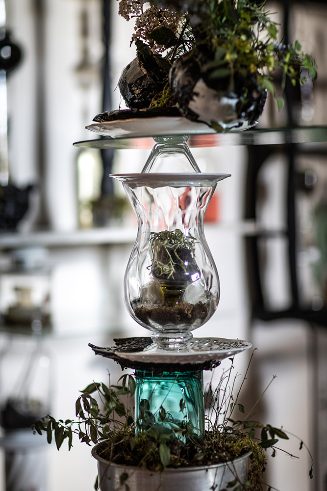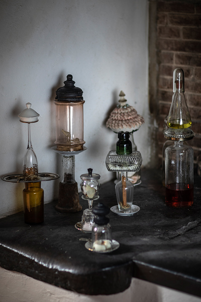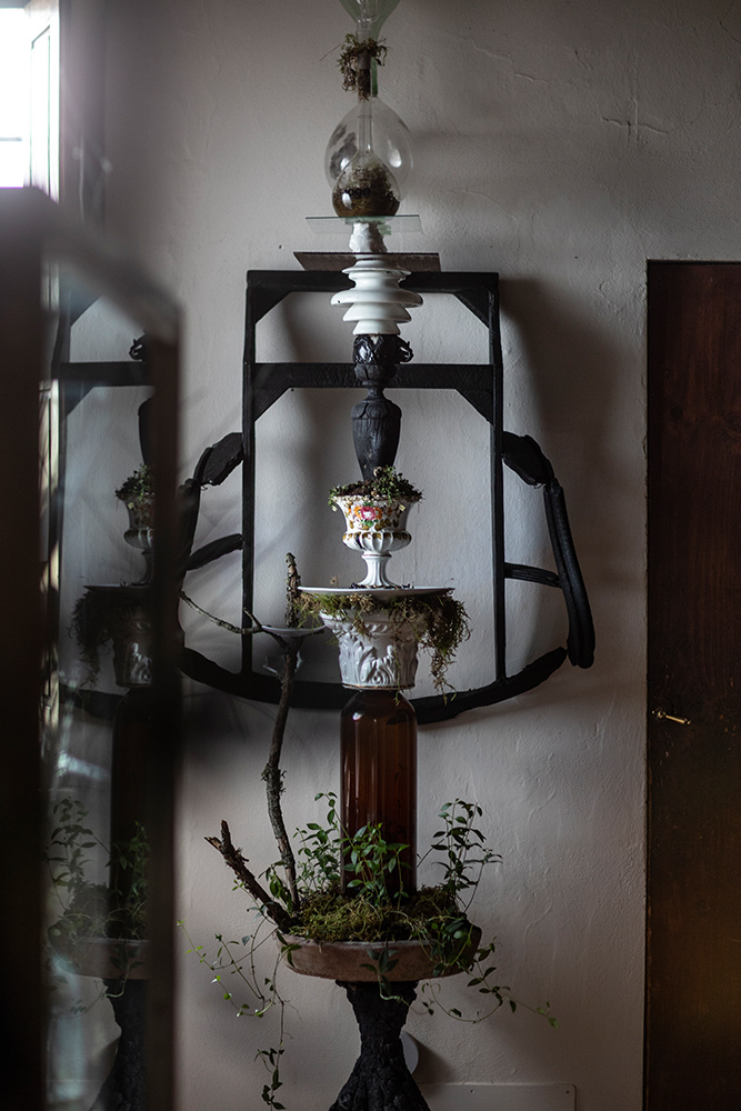 L’opera subisce una trasformazione materica continua, data dal cambiamento degli elementi organici di cui in parte è composta. Organico e inorganico si coniugano all’interno di contenitori della memoria attraverso i quali è possibile immergersi in un’ esperienza visiva e olfattiva.
