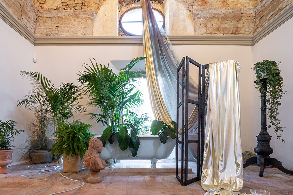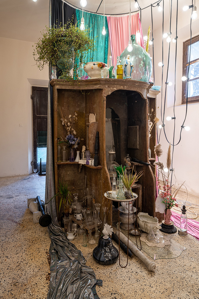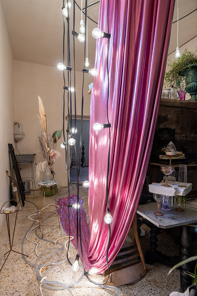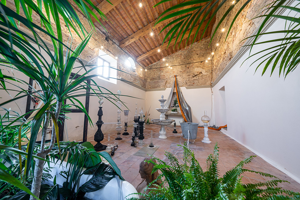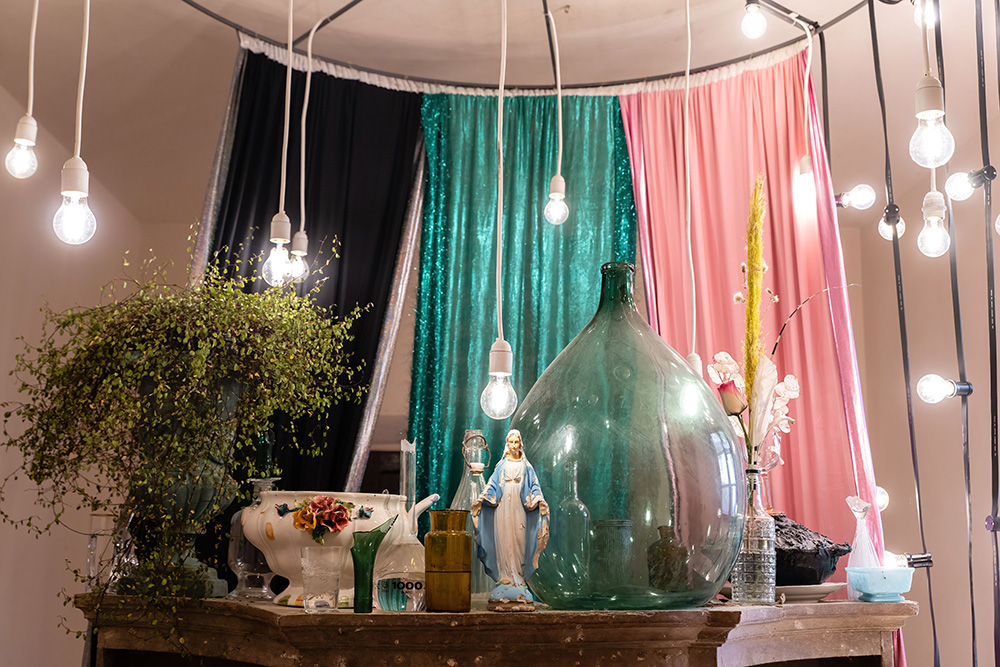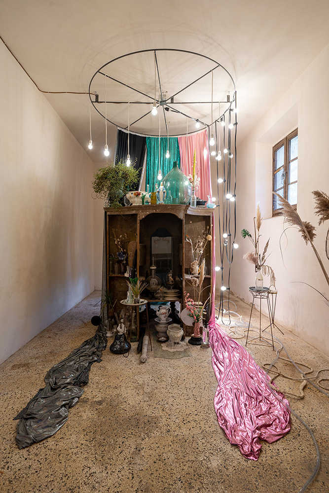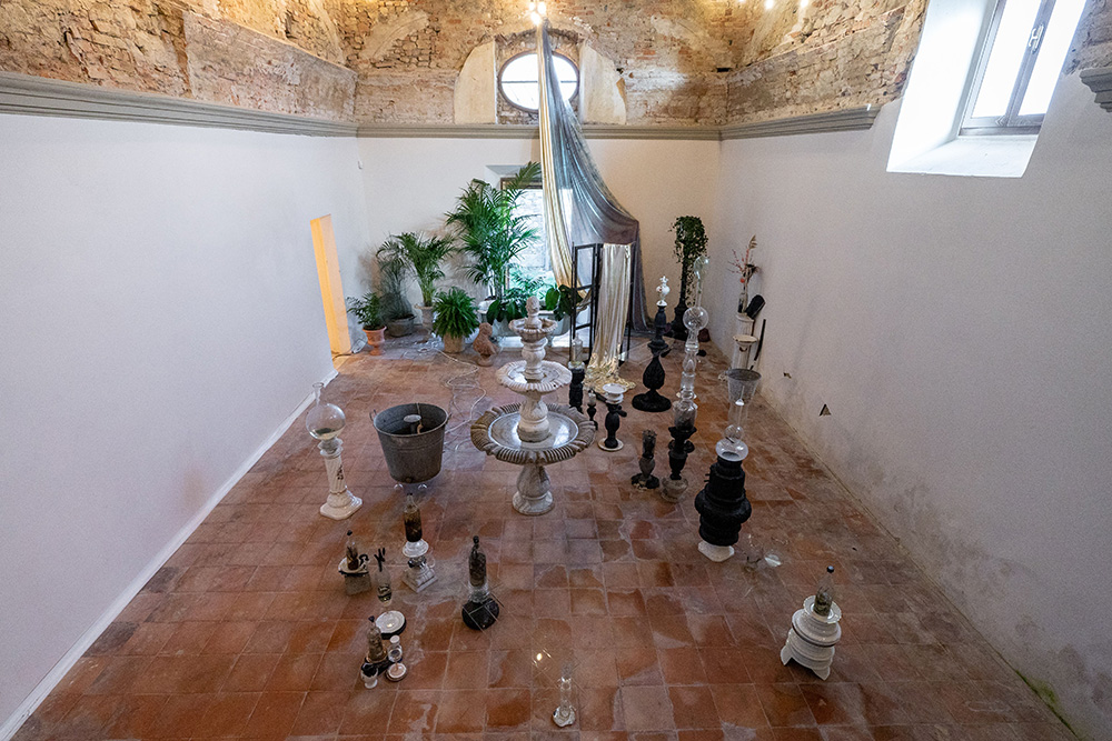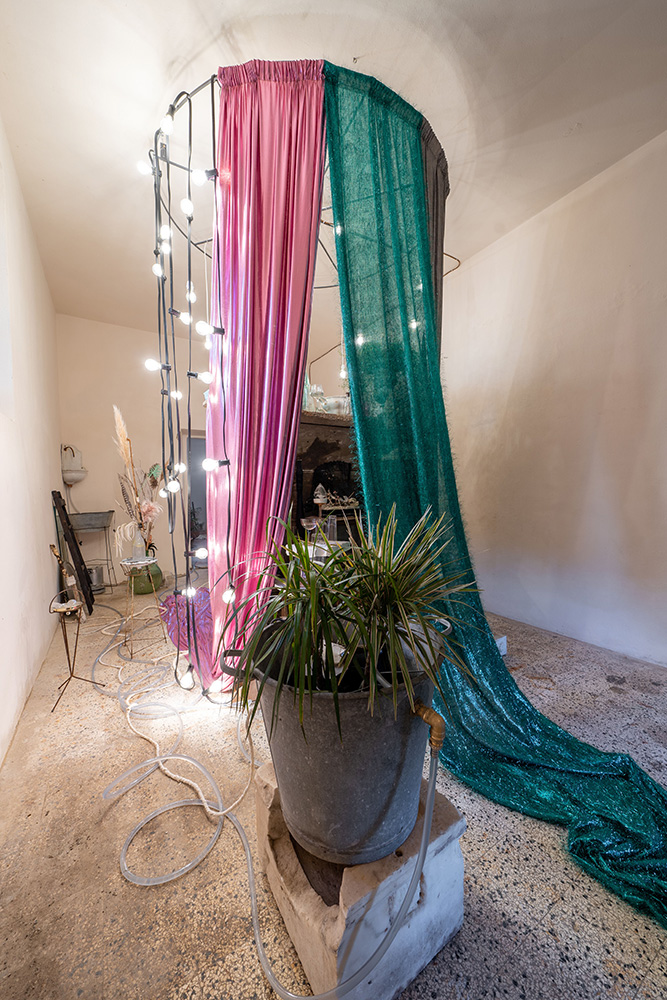 Tende e drappi lucenti e cangianti incorniciano gli altari della sala, che ospitano l’acqua, fonte prodigiosa. Una pala all’altare raffigura una composizione di rami e verdi foglie, elementi vivi di madre natura. Un vecchio confessionale, divenuto lui stesso altare, raccoglie e costudisce memorie. L’istallazione si completa di piante terrestri e acquatiche, filari di luci, come quelle usate per le feste di paese.