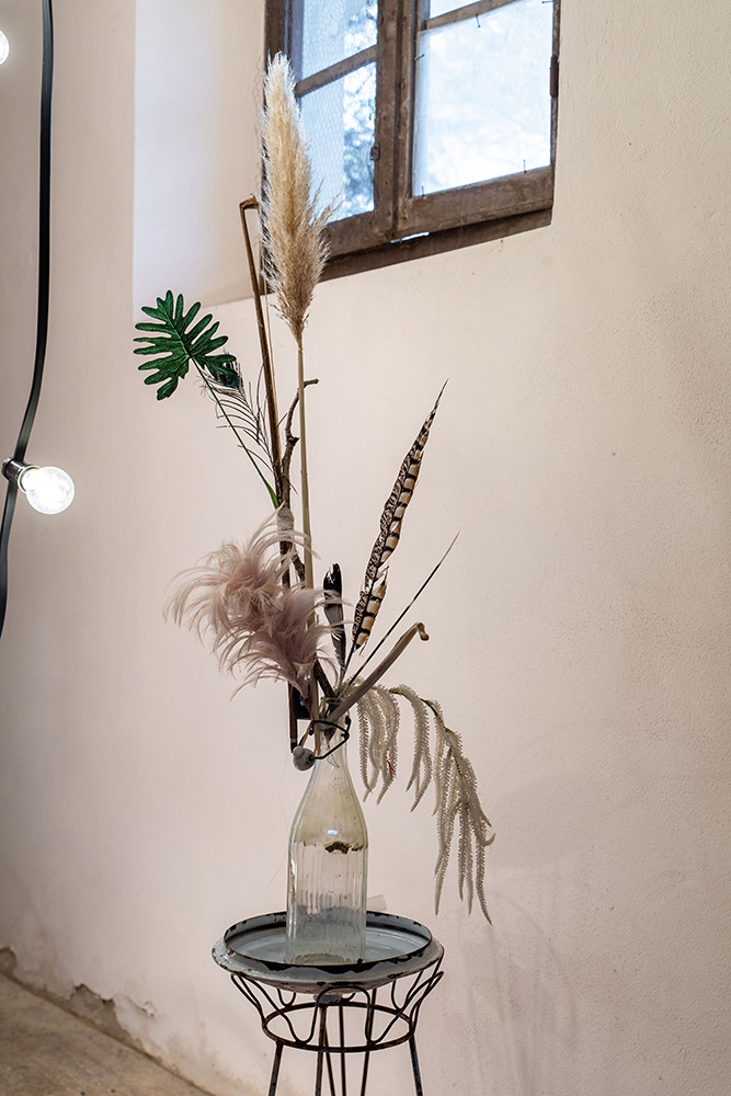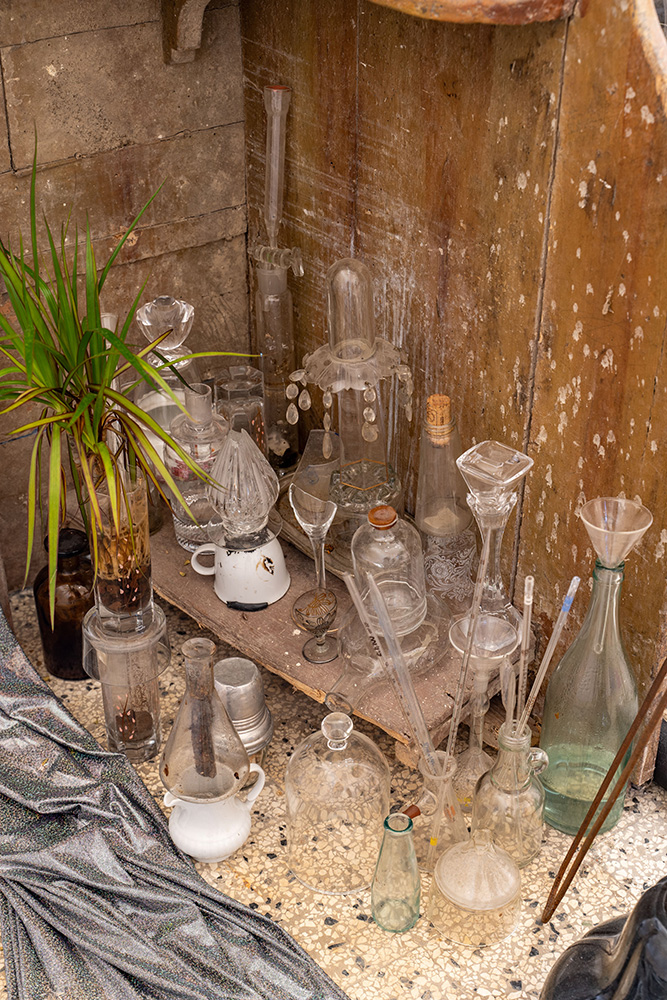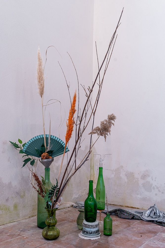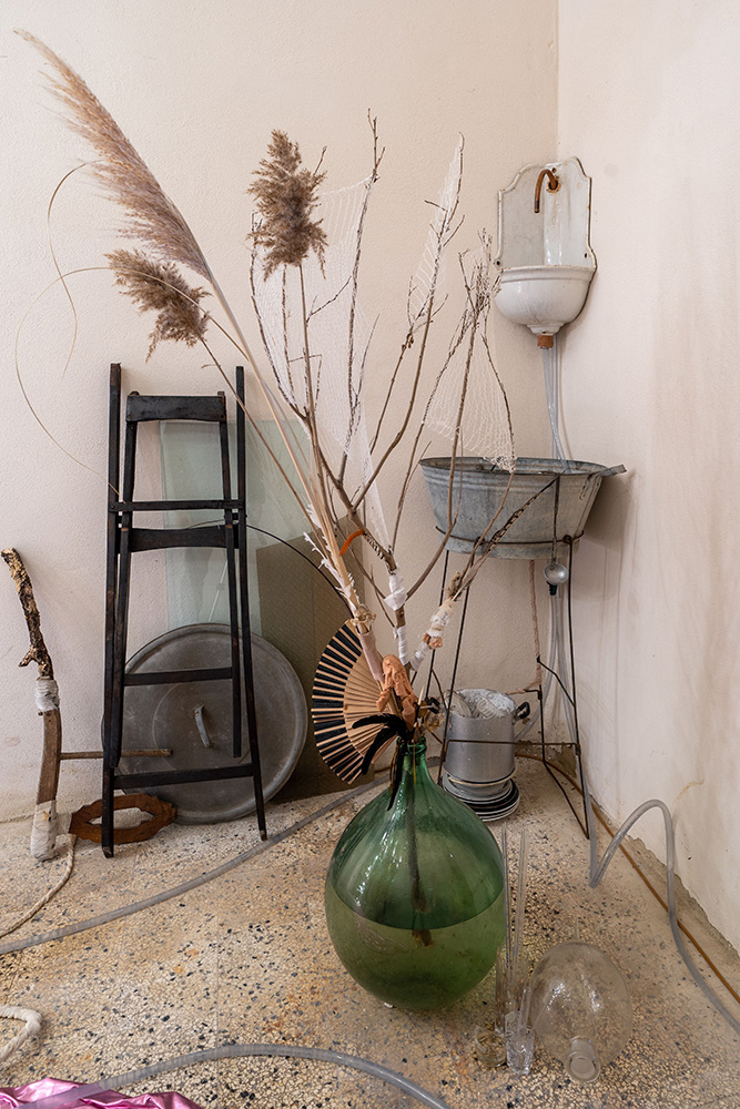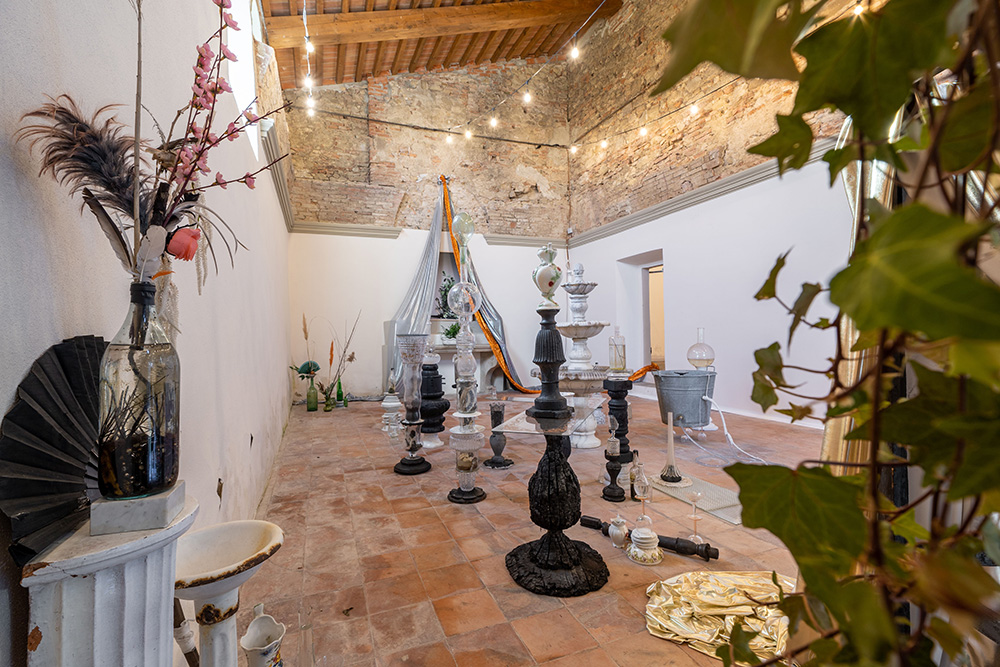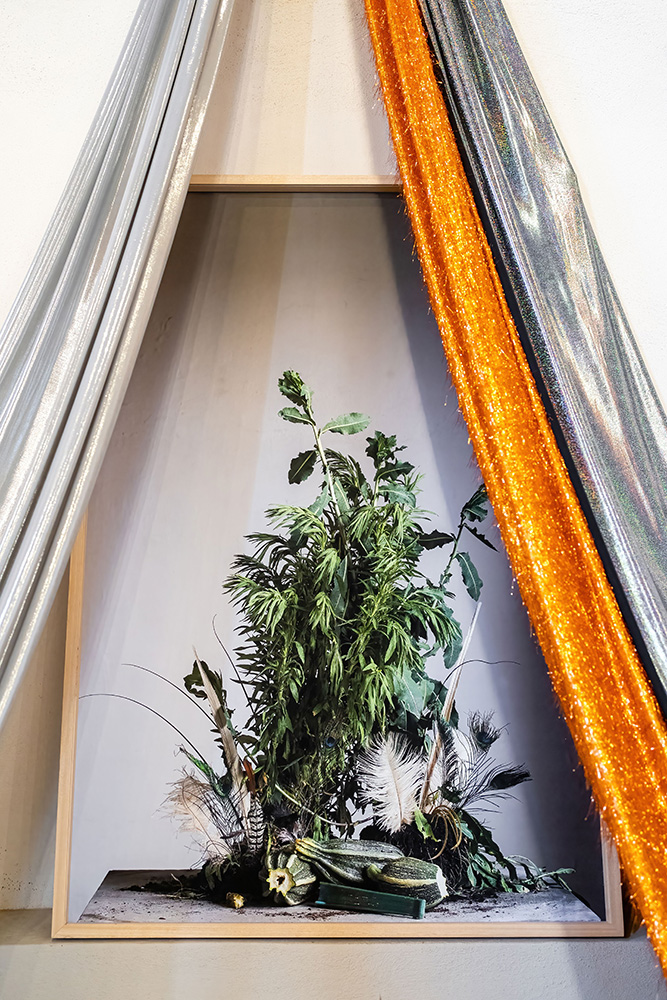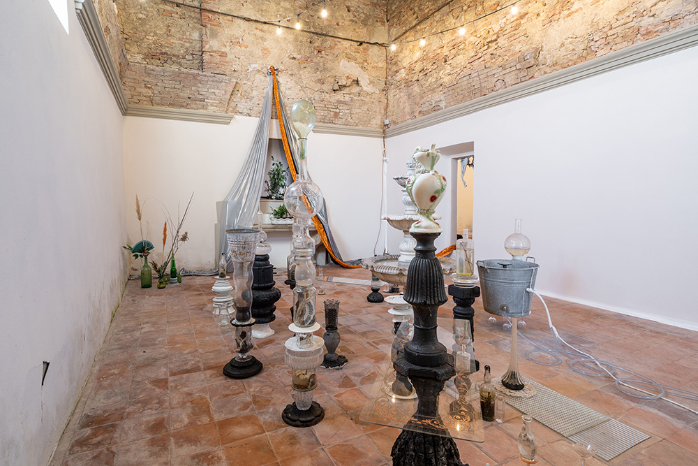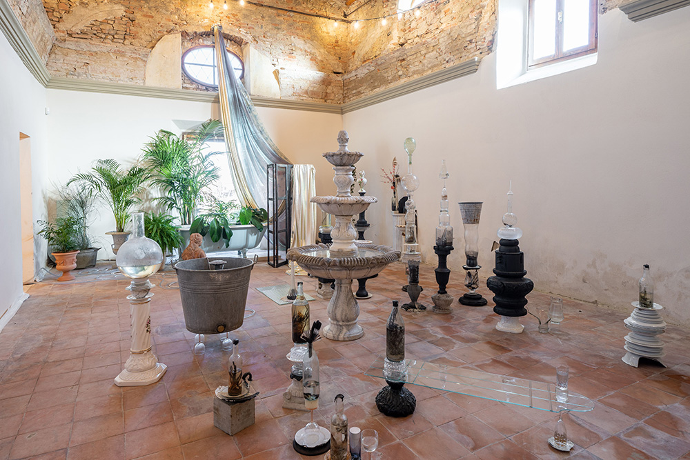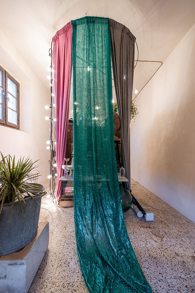 Tende e drappi lucenti e cangianti incorniciano gli altari della sala, che ospitano l’acqua, fonte prodigiosa. Una pala all’altare raffigura una composizione di rami e verdi foglie, elementi vivi di madre natura. Un vecchio confessionale, divenuto lui stesso altare, raccoglie e costudisce memorie. L’istallazione si completa di piante terrestri e acquatiche, filari di luci, come quelle usate per le feste di paese.