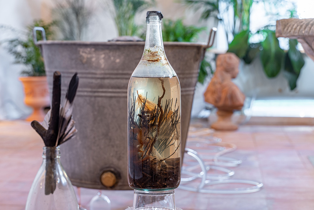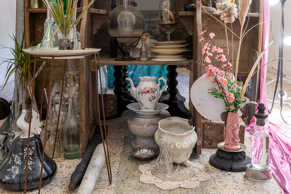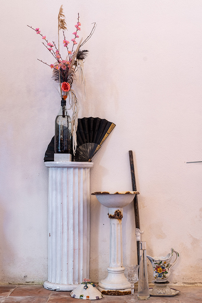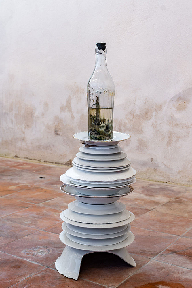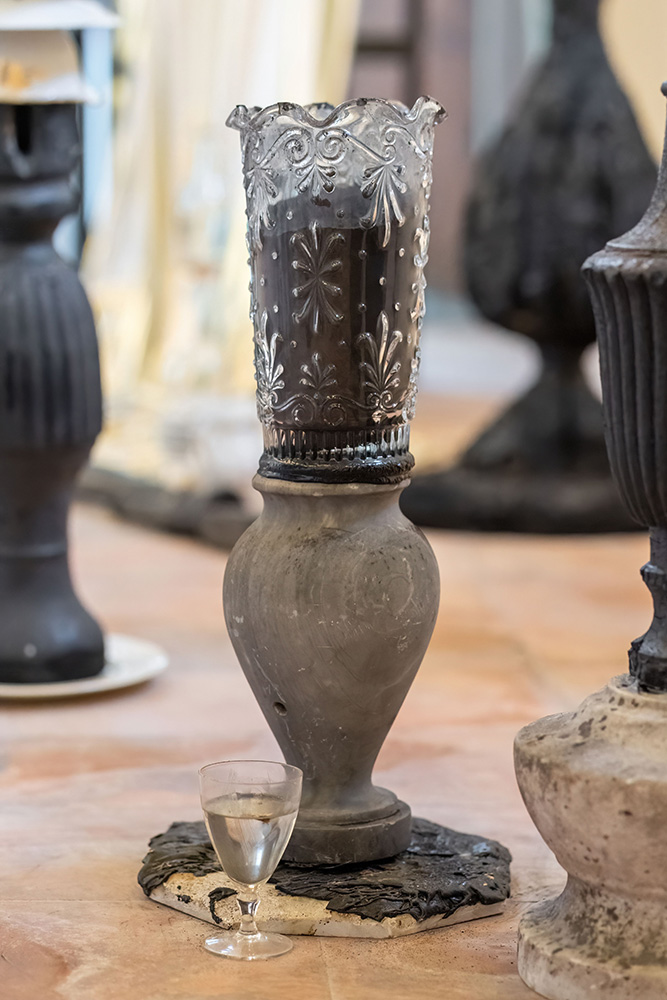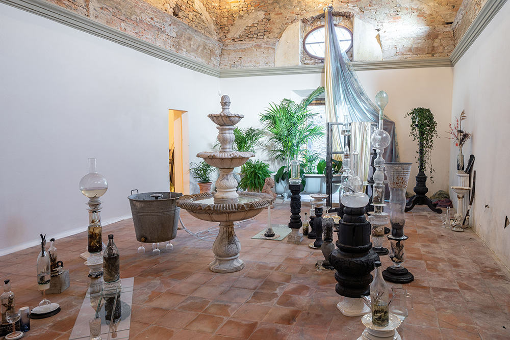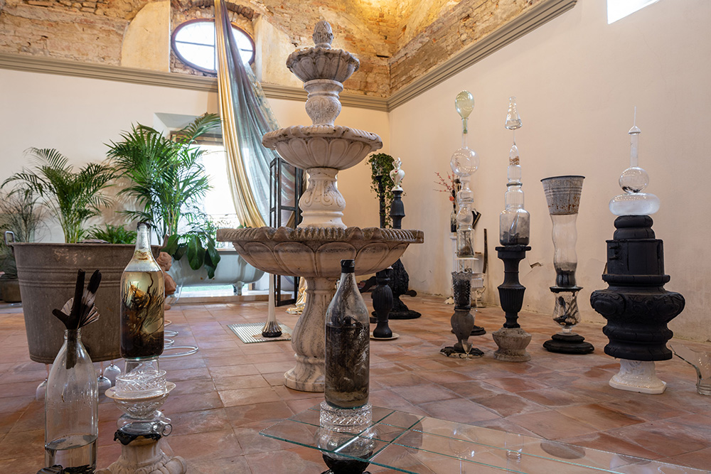 Sulla spinta di queste riflessioni l’artista realizza La Fonte della Giovinezza, un’istallazione molto articolata costituita da una serie di oggetti domestici -quali piatti, scodelle, bicchieri e vecchi cimeli- e vetri, resti, rovine architettoniche, colonne e busti, che si aggregano, si combinano e concentrano attorno a fontane, tinozze e antiche vasche da bagno, tutti richiamati e uniti dall’elemento acqua.