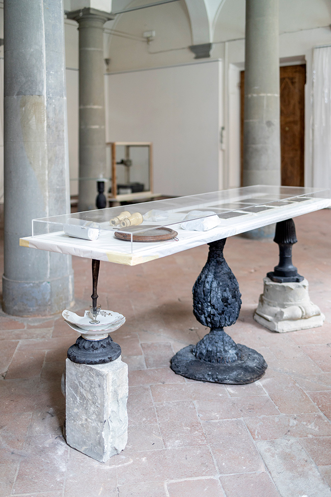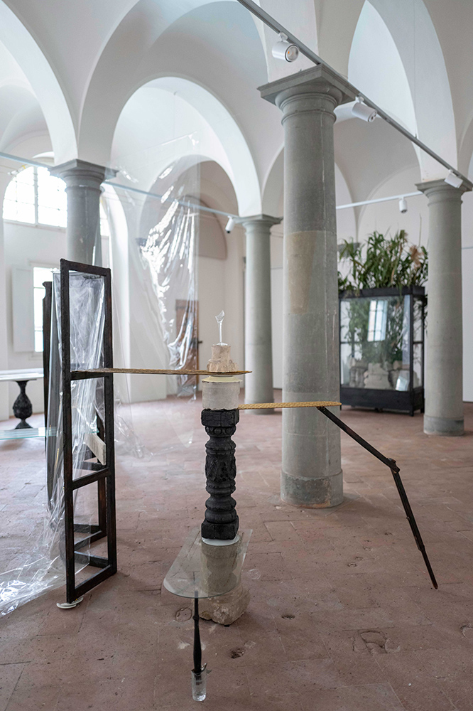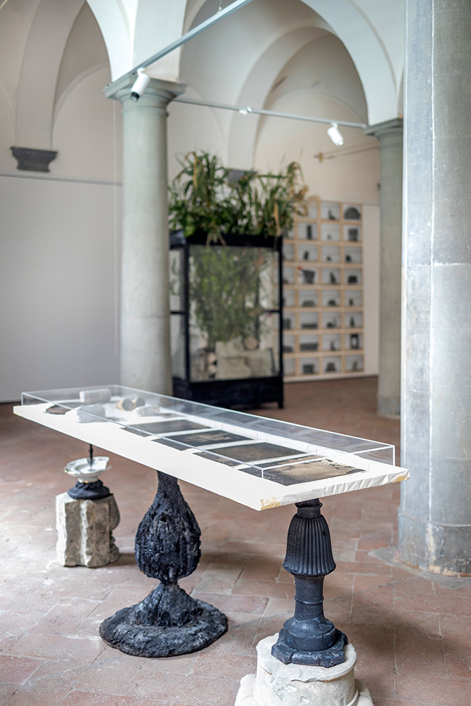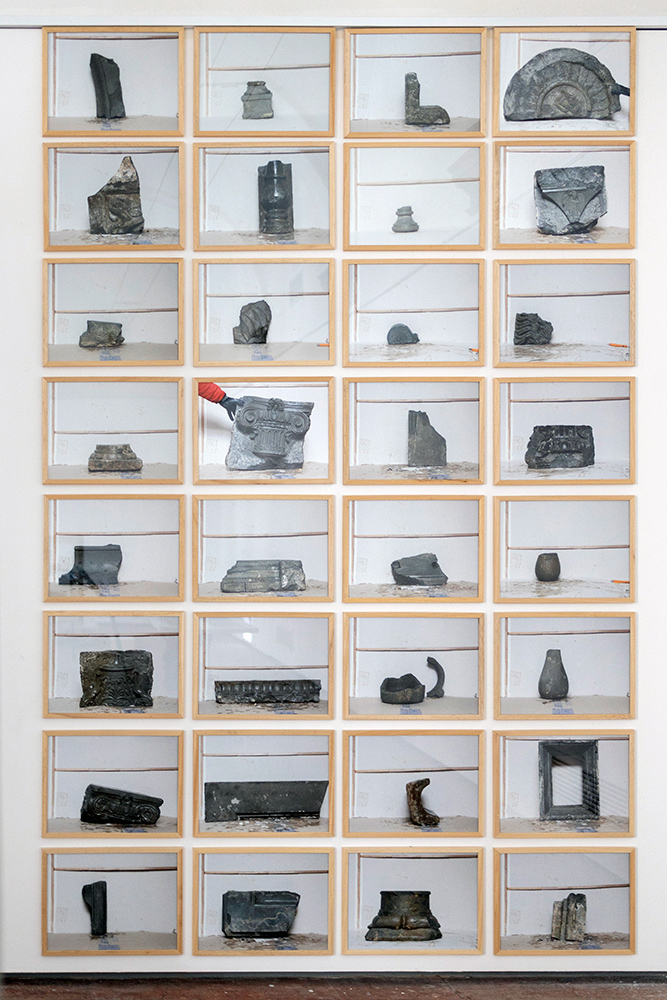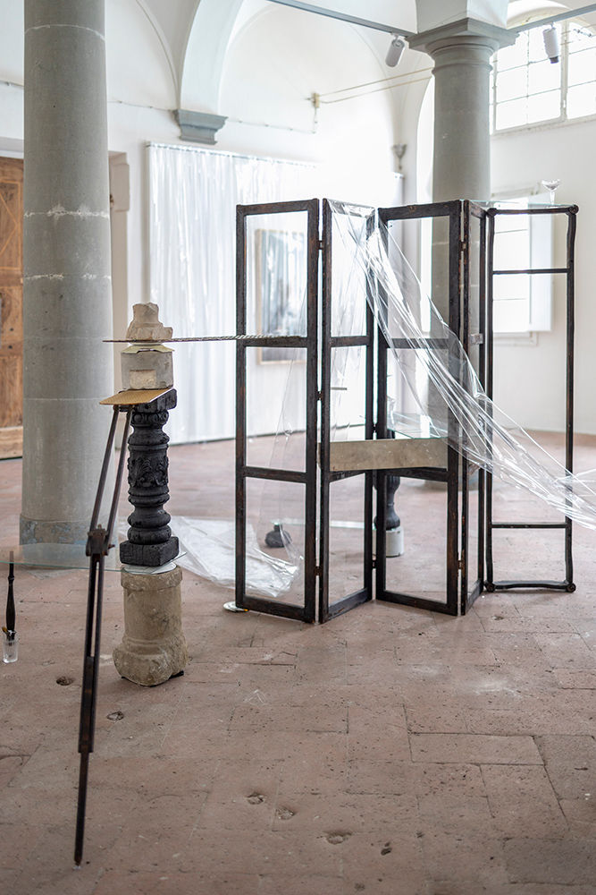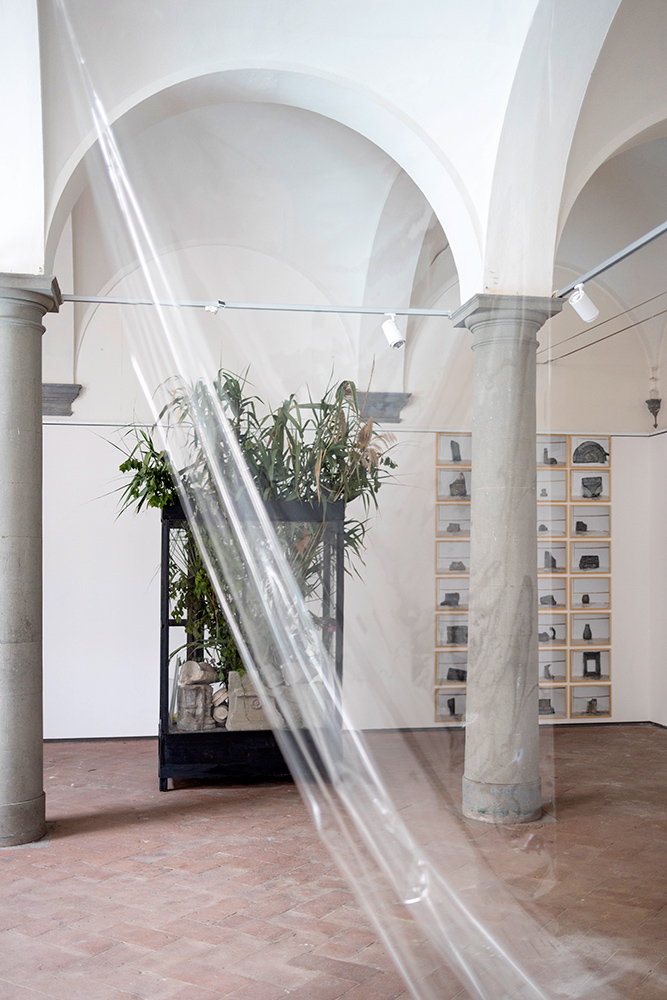 Qui il tema della visione diventa centrale, per raccontare quello che si vive entrando nel deposito e al tempo stesso per evocare la presenza di un oggetto. Quello che viene nascosto, in realtà, risalta perché immaginato, anelato. Il soggetto continua ad esistere, ma celato al nostro sguardo rivela tutto il vuoto che lascia il suo non esserci. Nel caso delle Murate i reperti lapidei sono visibili, ma cambiano di identità, non più riconoscibili come nelle foto stampate e affisse alla parete, ma ibridati con oggetti provenienti dallo studio dell’artista.
