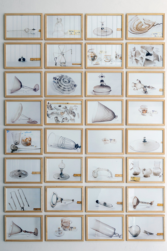 Chiara Bettazzi ha fotografato la realtà che ha percepito entrando in quegli spazi attraverso l’appropriazione degli oggetti e delle immagini, con un’attenzione particolare rispetto al dettaglio e al frammento. Poiché il frammento è un dato reale che può assumere diverse sembianze e significati, la scelta delle fotografie che Chiara ha scattato e affisso alle pareti della sala è ricaduta proprio su una selezione di oggetti frammentati: strumenti chimici, contenitori farmaceutici e vetri seicenteschi dell’Accademia del Cimento, provenienti dal Museo Galileo, uniti a elementi strutturali in pietra, attraversati dal tempo e dalla storia, che trovano oggi spazio e tutela nel deposito delle Murate.