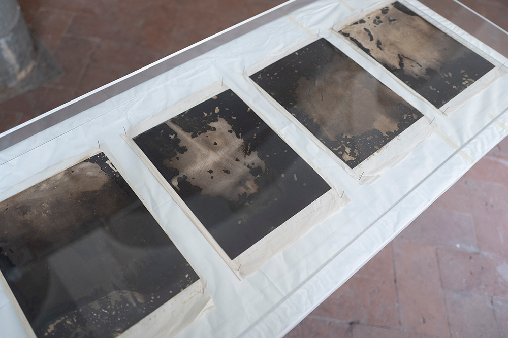L’esposizione si presenta all’occhio come un lavoro scultoreo, che oltre ad essere espressione di un processo in divenire, è una stratificazione di studio e documentazione su entrambi i depositi, insieme a lavori passati dell’artista, in particolare gli studi sulla visione e sulla fotografia, che trovano completamento e senso in questa nuova visione.