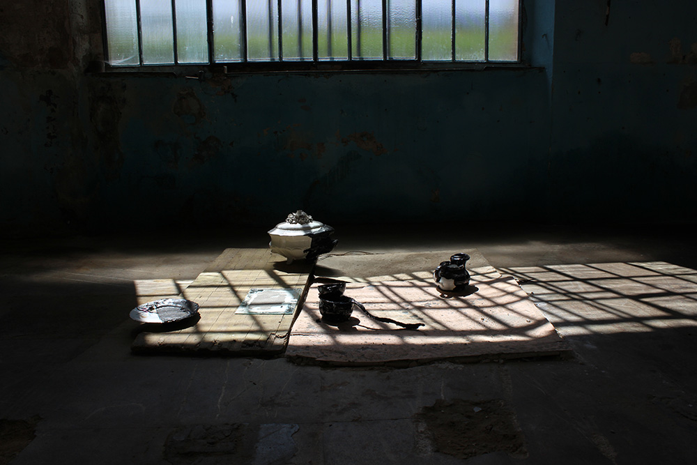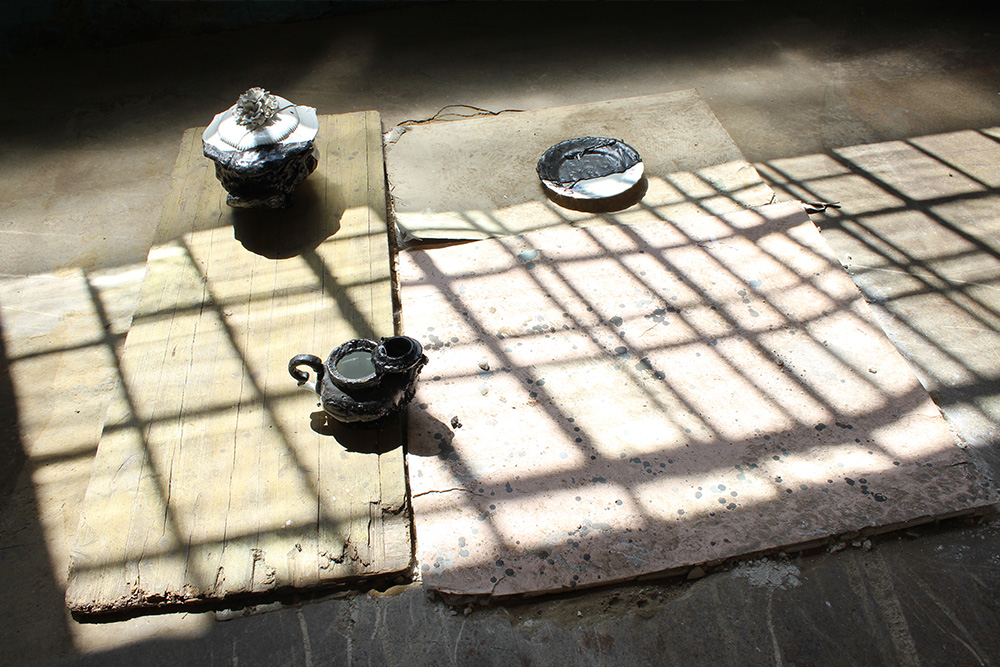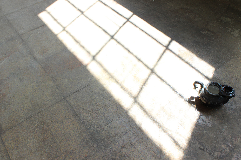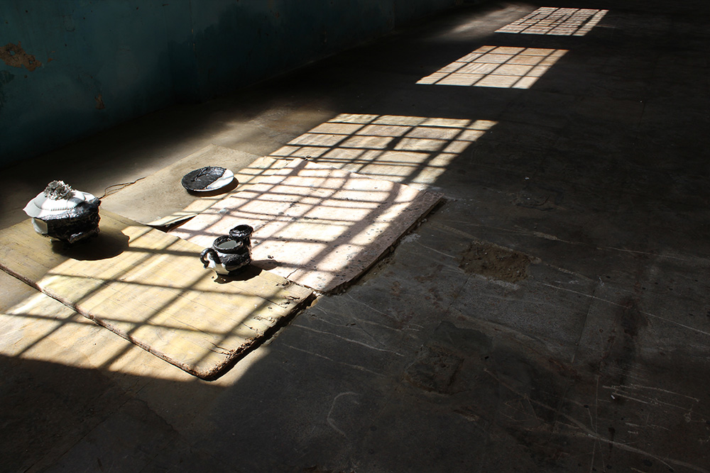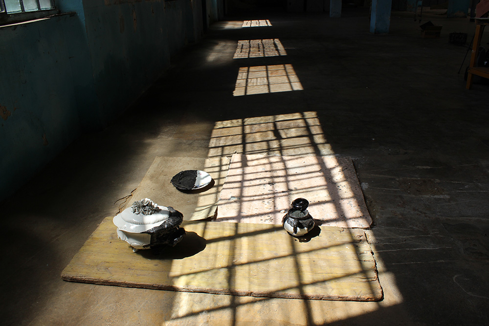 Il lavoro nasce dall’osservazione dei cambiamenti di luce che arrivano all’interno dello spazio industriale. I fasci di luce che come tagli ridisegnano geometrie sulla pavimentazione diventano supporti su cui cambiare continuamente posizione agli oggetti che fanno parte della mia collezione in studio. Gli oggetti appartengono al mio archivio e sono oggetti non finiti, ibridi, rimasti in bilico tra il puro oggetto di uso quotidiano e l’oggetto scultoreo.