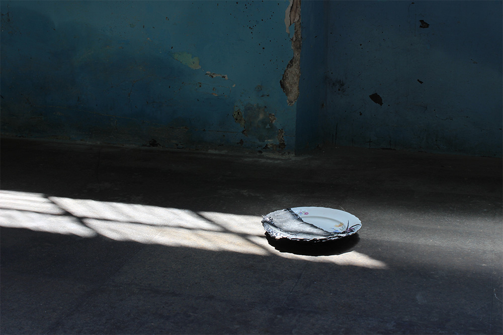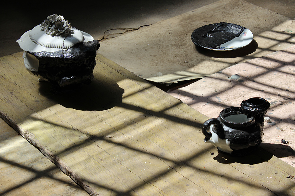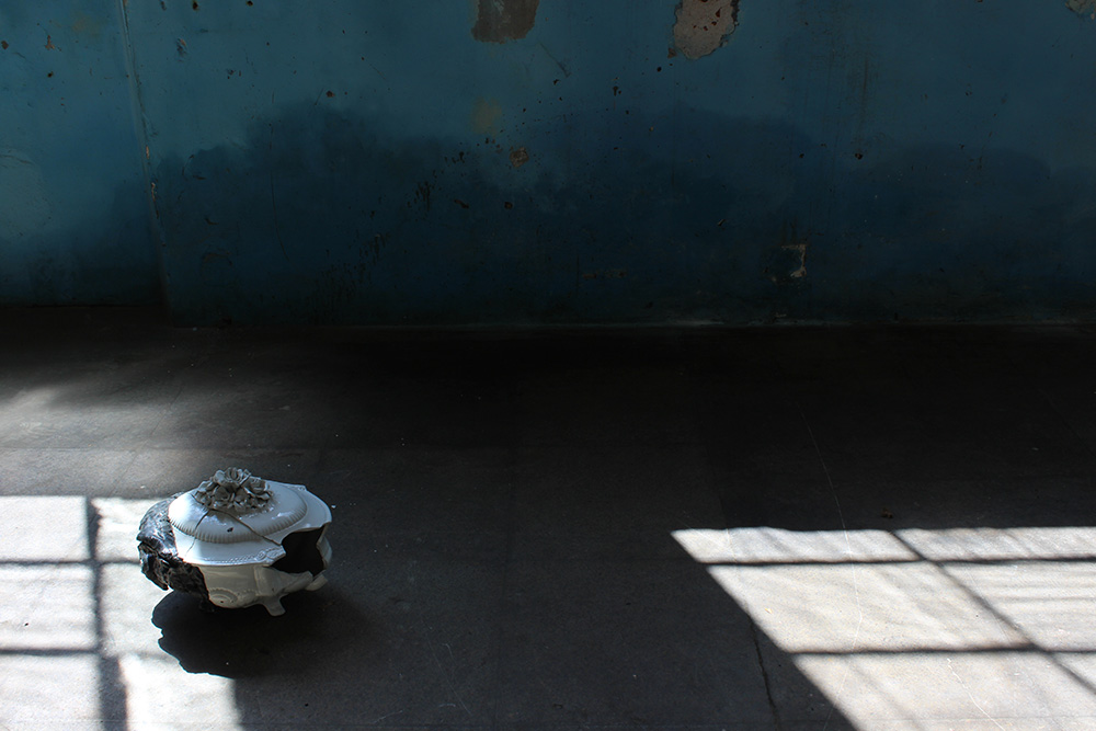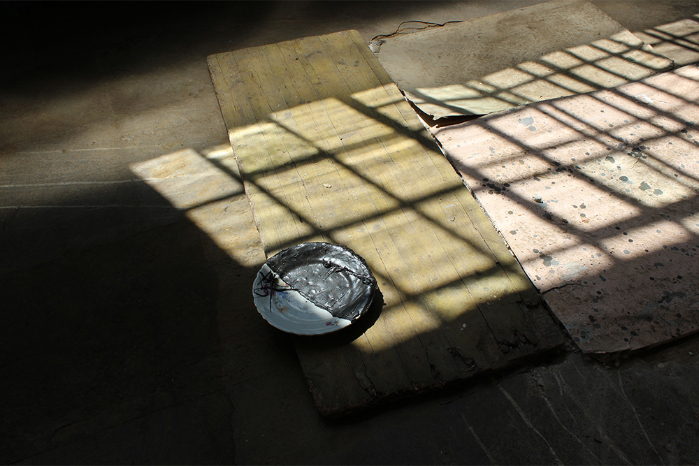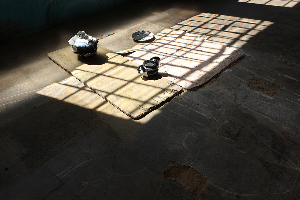 Il lavoro nasce dall’osservazione dei cambiamenti di luce che arrivano all’interno dello spazio industriale. I fasci di luce che come tagli ridisegnano geometrie sulla pavimentazione diventano supporti su cui cambiare continuamente posizione agli oggetti che fanno parte della mia collezione in studio. Gli oggetti appartengono al mio archivio e sono oggetti non finiti, ibridi, rimasti in bilico tra il puro oggetto di uso quotidiano e l’oggetto scultoreo.