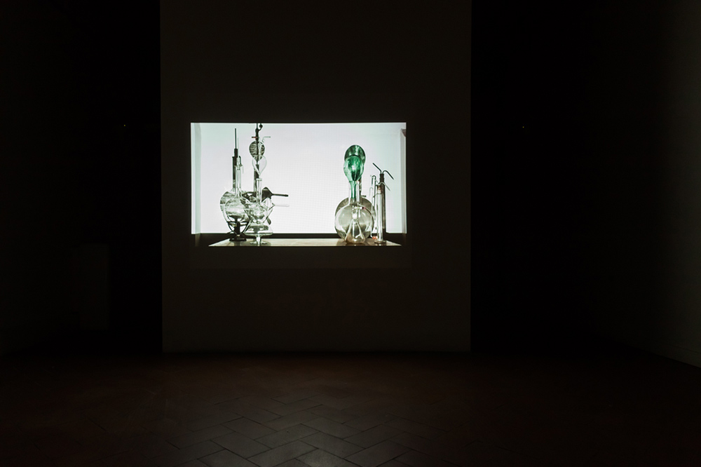 Abbiamo accennato a un’aria alchemica che qui si respira: ma attraverso i colli delle ampolle e le altre ramificazioni trasparenti di questa boscaglia vetrosa non si distilla, cuoce o raffina altra essenza se non la luce stessa: di volta in volta deviata, filtrata, stirata, respinta, esaltata, negata. Lo schermo si biforca come i sentieri di Borges, e ciò che appare sul davanti si ripercuote sul retro, colto però come in contro-tempo e in contro-luce, in una sfasatura irrisolvibile tra oggetto e simulacro, tra differenza e ripetizione, tra realtà e illusione. Ma queste che vediamo, presenti o evocate, non sono semplici comparse oggettuali, cose di una specie qualunque; il loro significato non si limita alla funzione formale che assolvono nell’economia dell’installazione.