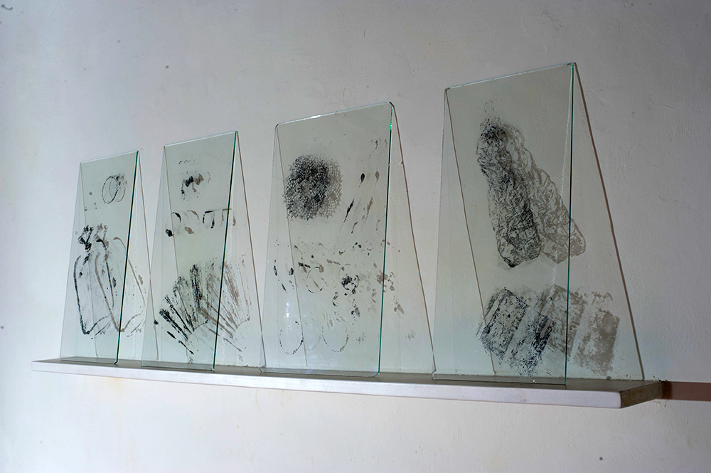 Gli oggetti sono protagonisti anche della serie costituita da cinque impronte su vetro che, come le proiezioni, sono state ottenute in maniera indiretta e, almeno nel primo caso, del tutto involontaria. Non si tratta infatti di oggetti toccati dal colore e poi depositati volontariamente su un supporto ma di oggetti che, utilizzati in origine per un altro scopo, sono stati appoggiati casualmente su un vetro, imprimendovi una leggera impronta, rivelatasi al momento della rimozione.