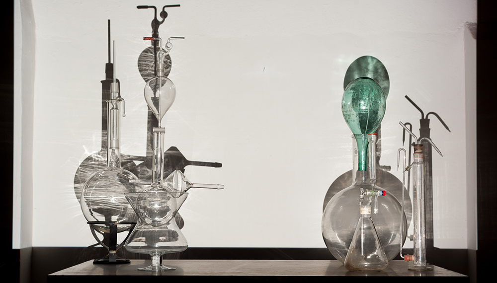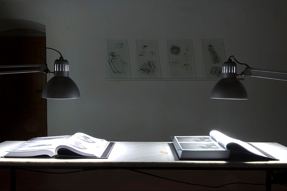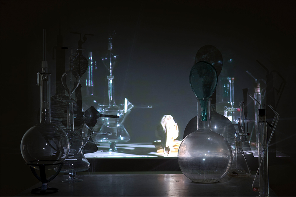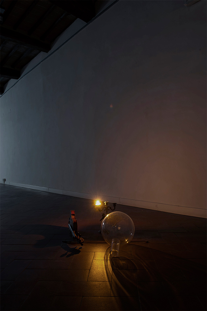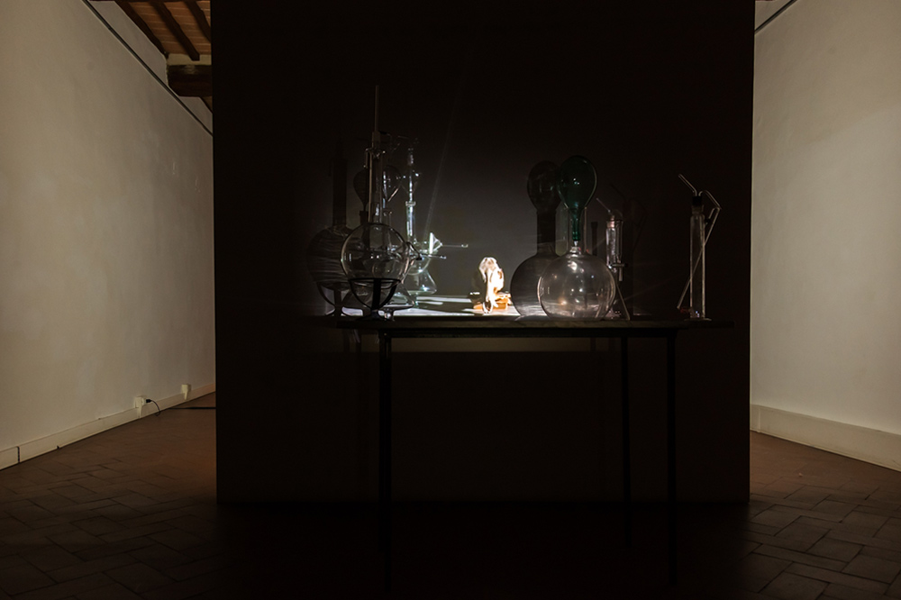 Questa anfibologia della vista emerge in tutta la sua ricchezza nell’installazione intitolata Still life: camera obscura e studio alchemico, il dispositivo allestito da Chiara Bettazzi evoca una scena che si sovrappone a se stessa raddoppiandosi in modo lacunoso, con sempre alcunché di deficitario nelle sue sovrapposizioni simulacrali, come se, potendo magicamente duplicare la visione sul retro dell’occhio, qualcosa venisse dimenticato per strada.
