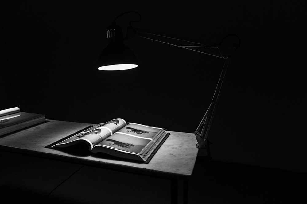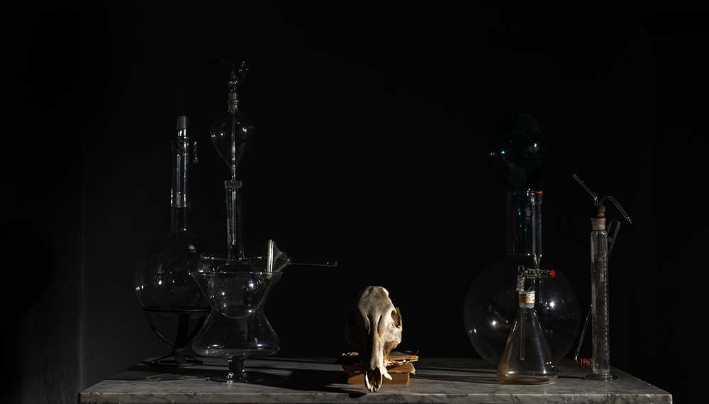 3) una proiezione della foto sulla stessa composizione che l’ha originata con il conseguente gioco d’ombre portate che scaturiscono dalla sovrapposizione, introducendovi una leggera sfasatura e maggiorazione di scala. Il risultato dà vita a una sorta di palinsesto, in cui campeggia un’assenza: il teschio animale che, presente in proiezione, manca al suo posto, sul tavolo accanto agli oggetti;