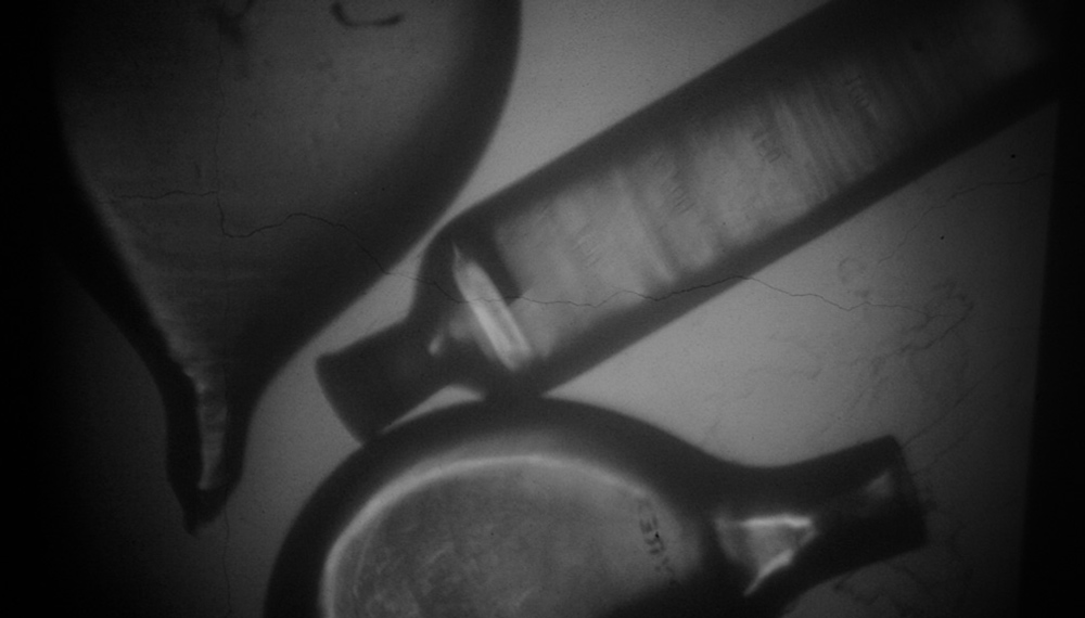 A rigore, dunque, non c’è alcun video: tutto ciò che è movimento/azione è posto fuori campo. A far film, per una durata di circa 40 minuti, è solo il susseguirsi di pose statiche, lo scivolare (il passaggio, il concatenamento) da un’immagine all’altra, che occasionalmente incorpora delle pause bianche. Il video che ne scaturisce non mostra gli oggetti sul vetro della lavagna luminosa ma unicamente la loro ombra proiettata su parete. “Il risultato visivo -sottolinea Bettazzi- rimane nell’ambiguità, restando in bilico fra l’apparizione dell’oggetto e il suo fantasma... Partendo dall’ambiguità di un’immagine e riproiettandolo... sul muro, l’oggetto mi regalava una nuova immagine che non era né una mera radiografia né un puro rayogramma (10), ma si manifestava davanti a me come se fosse un disegno tracciato sul muro. Questa nuova visione mi ha fatto riflettere sulla parola grafia, e sul suo significato... originario, portandomi a considerare quest’immagine luminosa e il suo legame diretto con la scrittura e quindi con l’incisione”.
