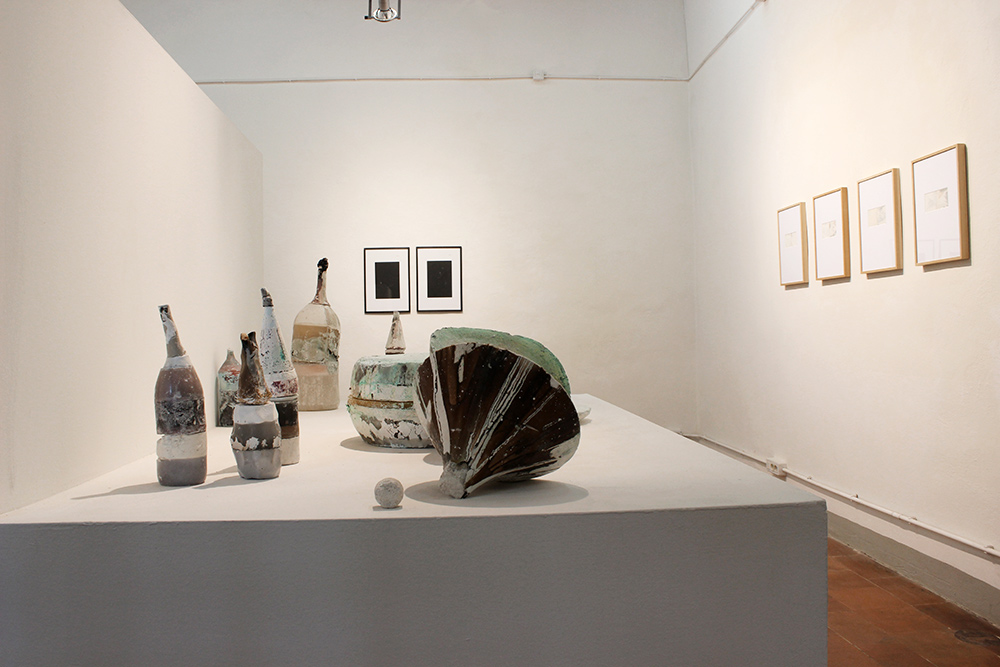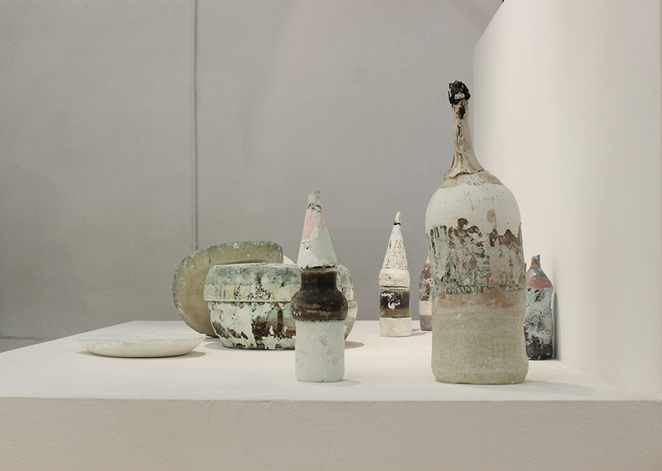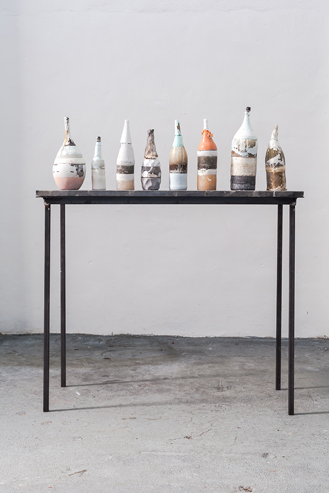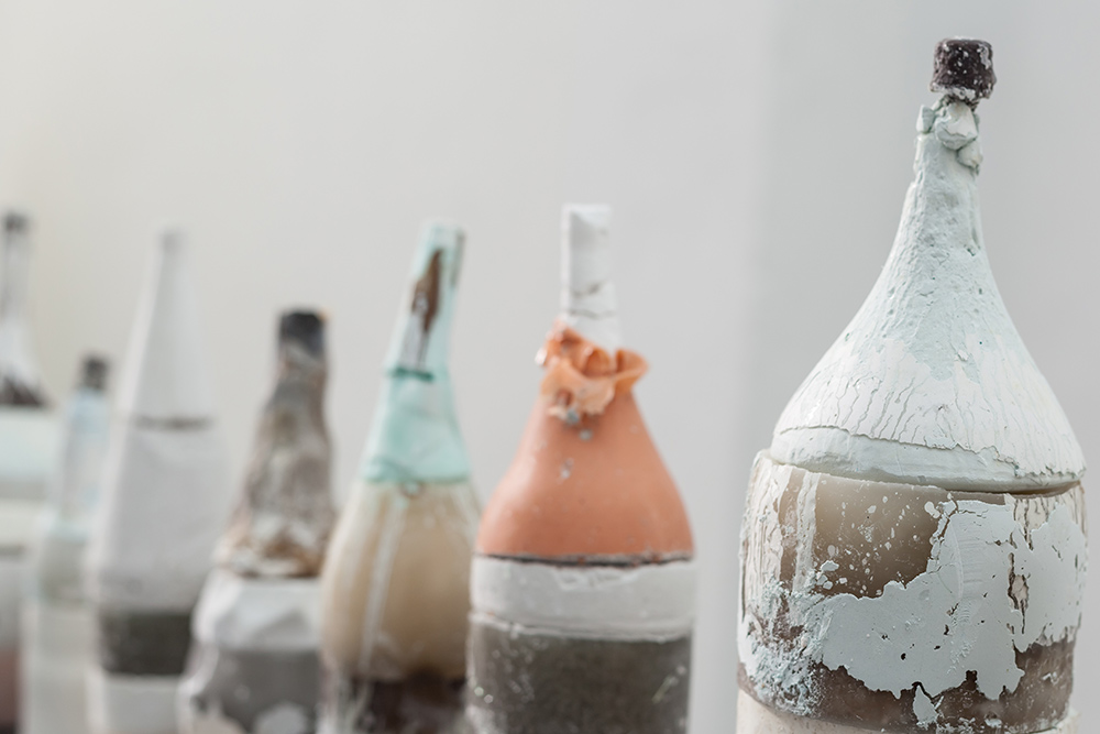 Magic Bottles è un lavoro scultoreo formato da una serie di calchi di bottiglie di vetro provenienti dallo studio dell’artista.