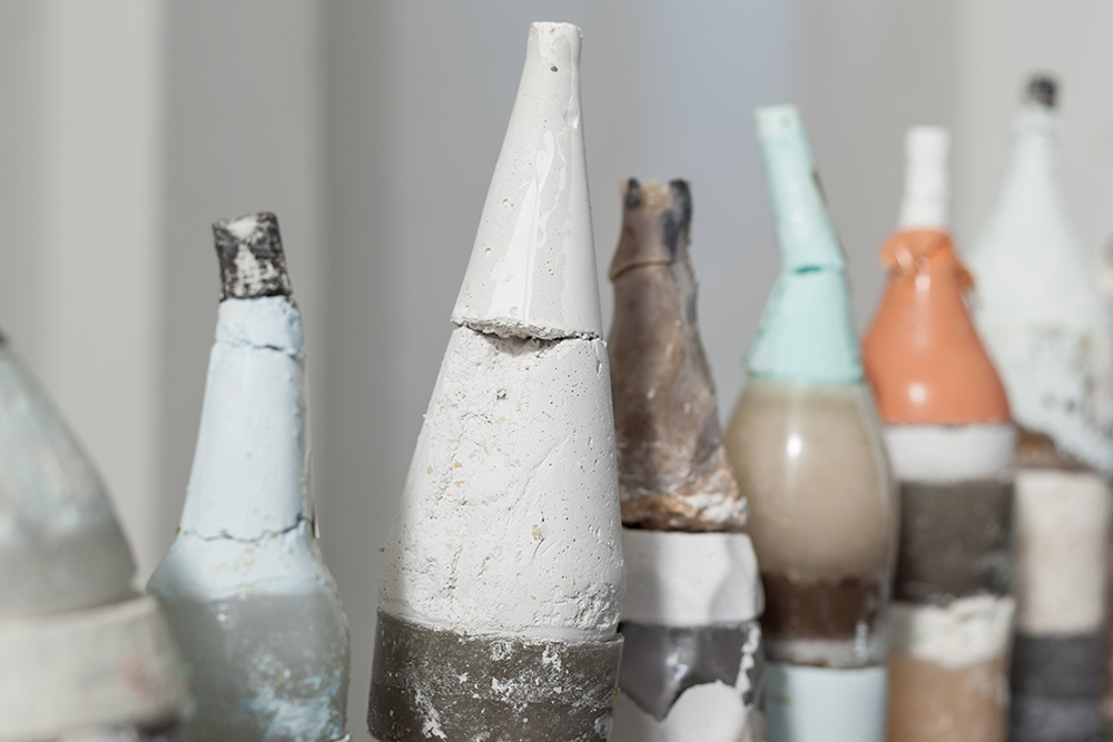 Una serie di stratificazioni ricavate dal riempimento del vuoto interno delle bottiglie. La materia formata da pigmento, gesso, cera, cemento si solidifica in tempi diversi creando una sorta di pittura scultorea.